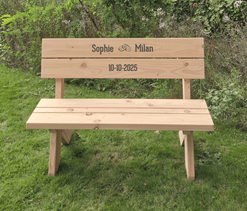 Onze houten tuinbanken worden vaak gekozen voor bijzondere momenten. Door een Douglas tuinbank te combineren met een gravering ontstaat een persoonlijk product dat jarenlang meegaat. Van een klein tuinbankje tot een robuuste houten tuinbank, elke bank vertelt zijn eigen verhaal. Wat Houtmoat uniek maakt, is de mogelijkheid om je bank te personaliseren. We graveren teksten, namen of bijzondere data rechtstreeks in het hout. Dit maakt onze banken uitermate geschikt als: