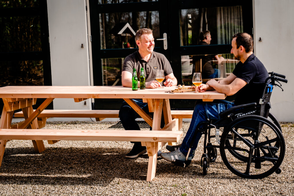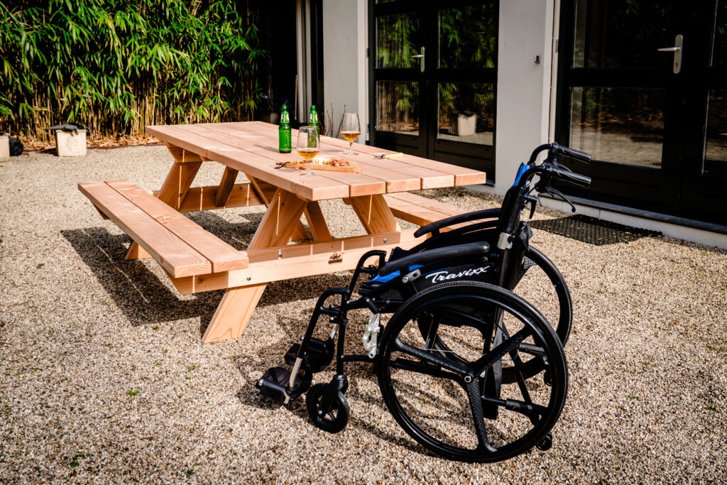 Op zoek naar een rolstoelvriendelijke picknicktafel van stevig Douglas hout?